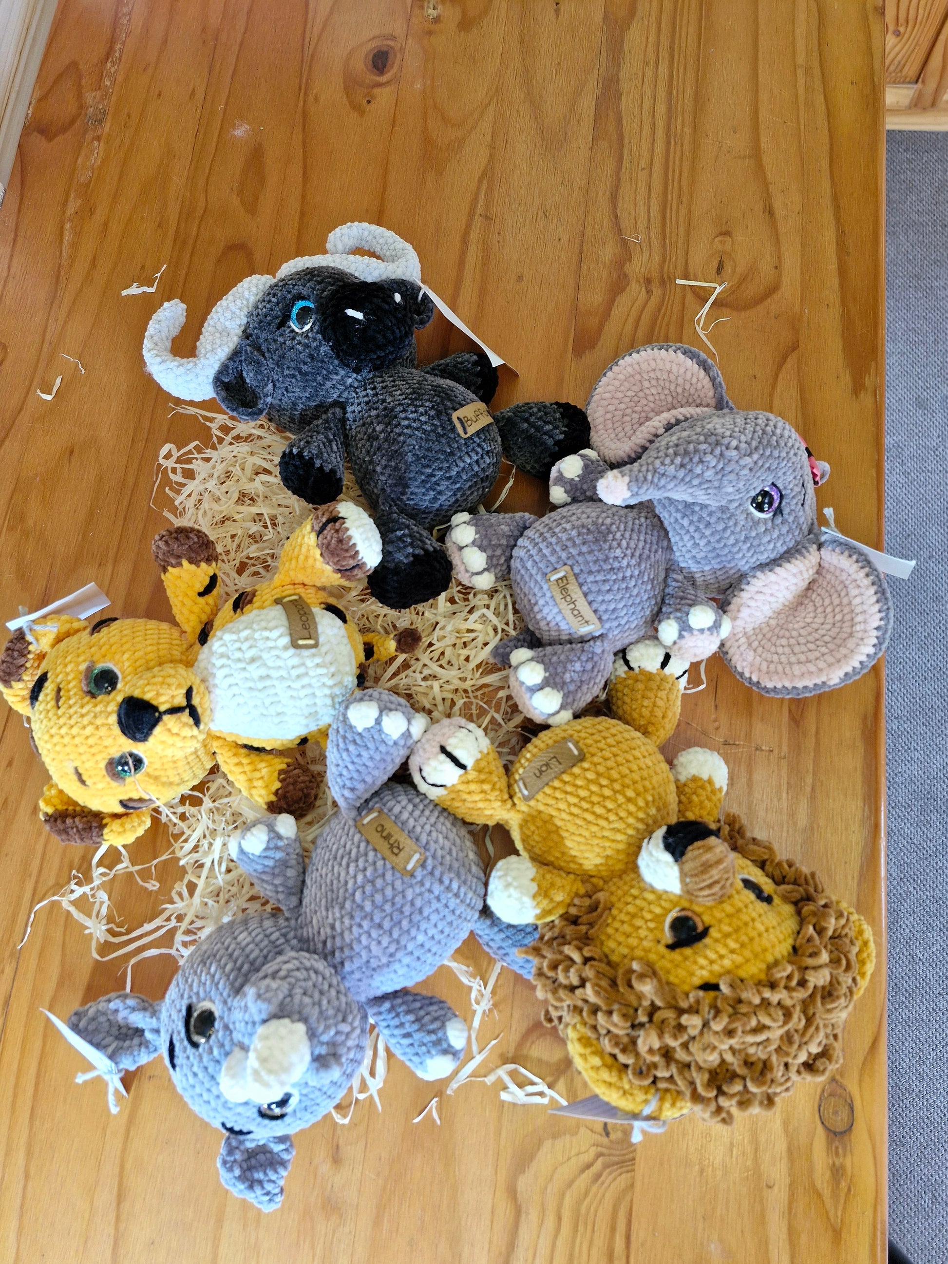 Celebrate the beauty and spirit of Africa with our handcrafted Amigurumi Big 5 collection. Featuring the iconic lion, elephant, rhino, buffalo, and leopard, each animal is lovingly crocheted with attention to detail and character. Designed to bring warmth and imagination into nurseries and children’s spaces, this collection blends playful charm with timeless craftsmanship. Perfect as decorative keepsakes or meaningful gifts, the Big 5 Amigurumi collection honors African wildlife while celebrating the art of handmade creation.