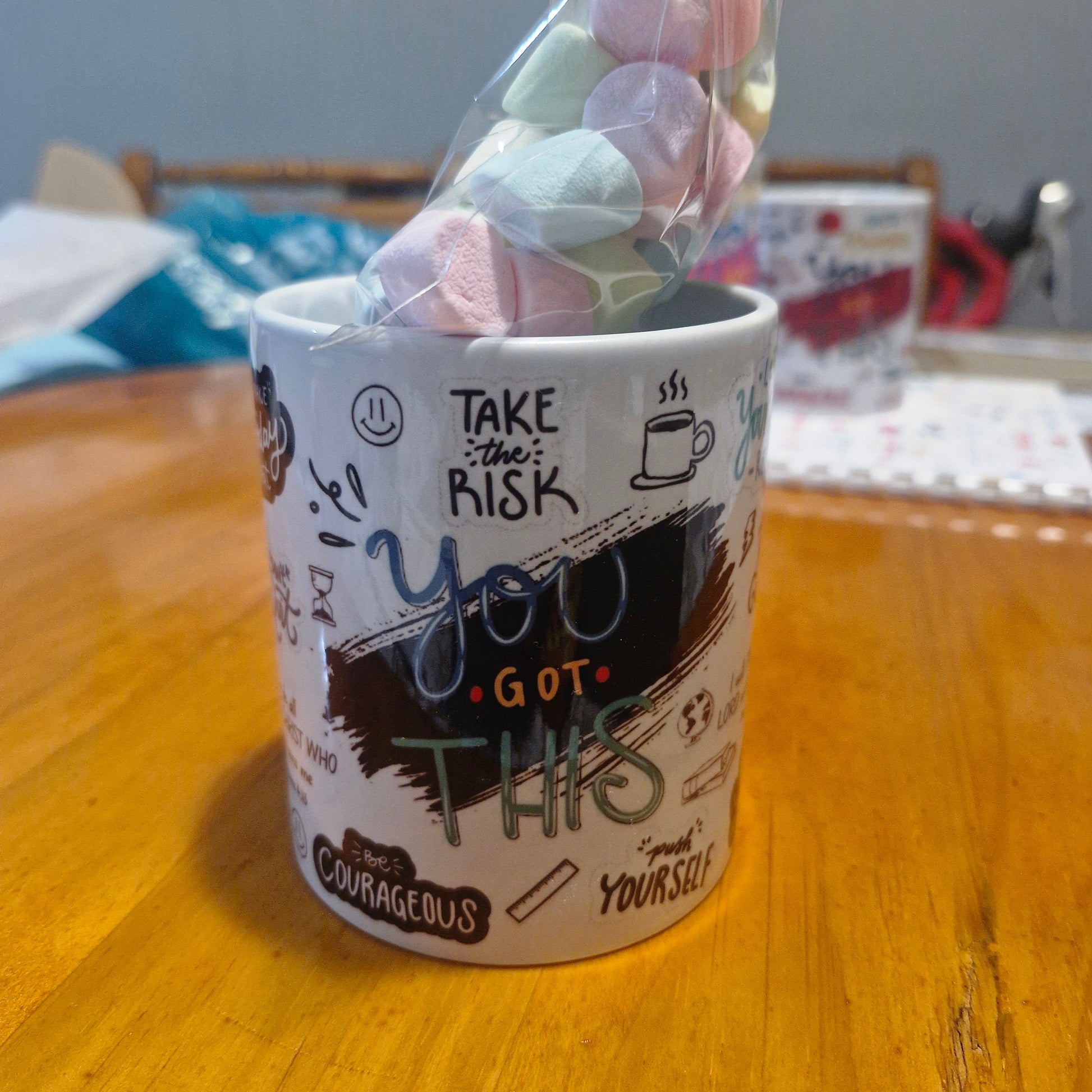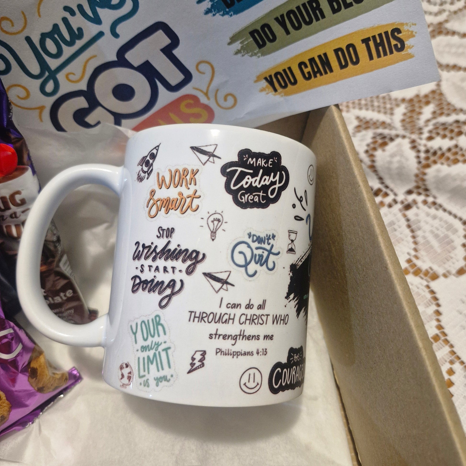2 x Hot Chocolates, Marshmellows, You Got This Coffee Mug, Kitkat, Fruit Flakes, Mento's, Sticky Notes, Tissues, Highlighters, Coloured Pens, Cookies, PopCorn, Cozy Socks, Exam Planner & Personalized Card.
