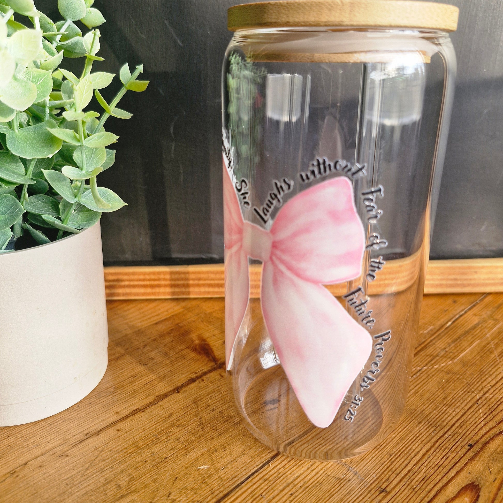 Celebrate strength and grace with our beautifully crafted Libbey glass, featuring the inspiring verse “She is clothed with strength and dignity, and she laughs without fear of the future” – Proverbs 31:25. Elegantly adorned with a soft pink bow design, this glass is perfect for gifting, daily encouragement, or special occasions that honor strong, faith-filled women.